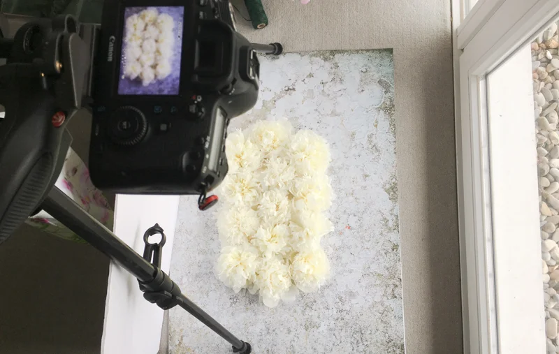The lighting set up here is very simple: indirect natural daylight coming from above the peonies (to the right in the image above). Notice the reflector propped up against the tripod legs: it is a sheet of 5mm foamcore and reflects enough light back onto the near peonies to even out the light.